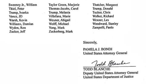 Bondi stressed that inclusion in the materials does not imply criminal involvement or wrongdoing. In her letter, she wrote:
